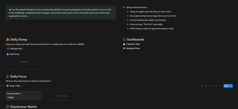 The Brain Dump & Prioritizer is a minimalist yet powerful productivity system built for thinkers, doers, creatives, and busy people who juggle a million things at once. This template gives you a clean space to offload every task, idea, or thought — and then intelligently helps you prioritize what really matters using the classic Eisenhower Matrix method.
